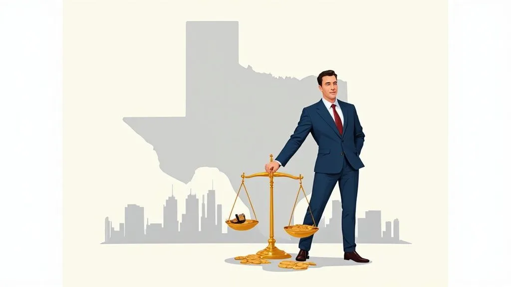 This model is standard for serious felonies or cases where the strategy might have to pivot multiple times. The total cost can vary significantly depending on how complicated things get. For example, in a major Texas city like Houston, a misdemeanor might run a flat $3,000 to $10,000, but a complex felony trial can easily soar past $25,000. With hourly rates sometimes hitting $500 to $1,000 for experienced attorneys, you can see how costs pile up in a long fight.